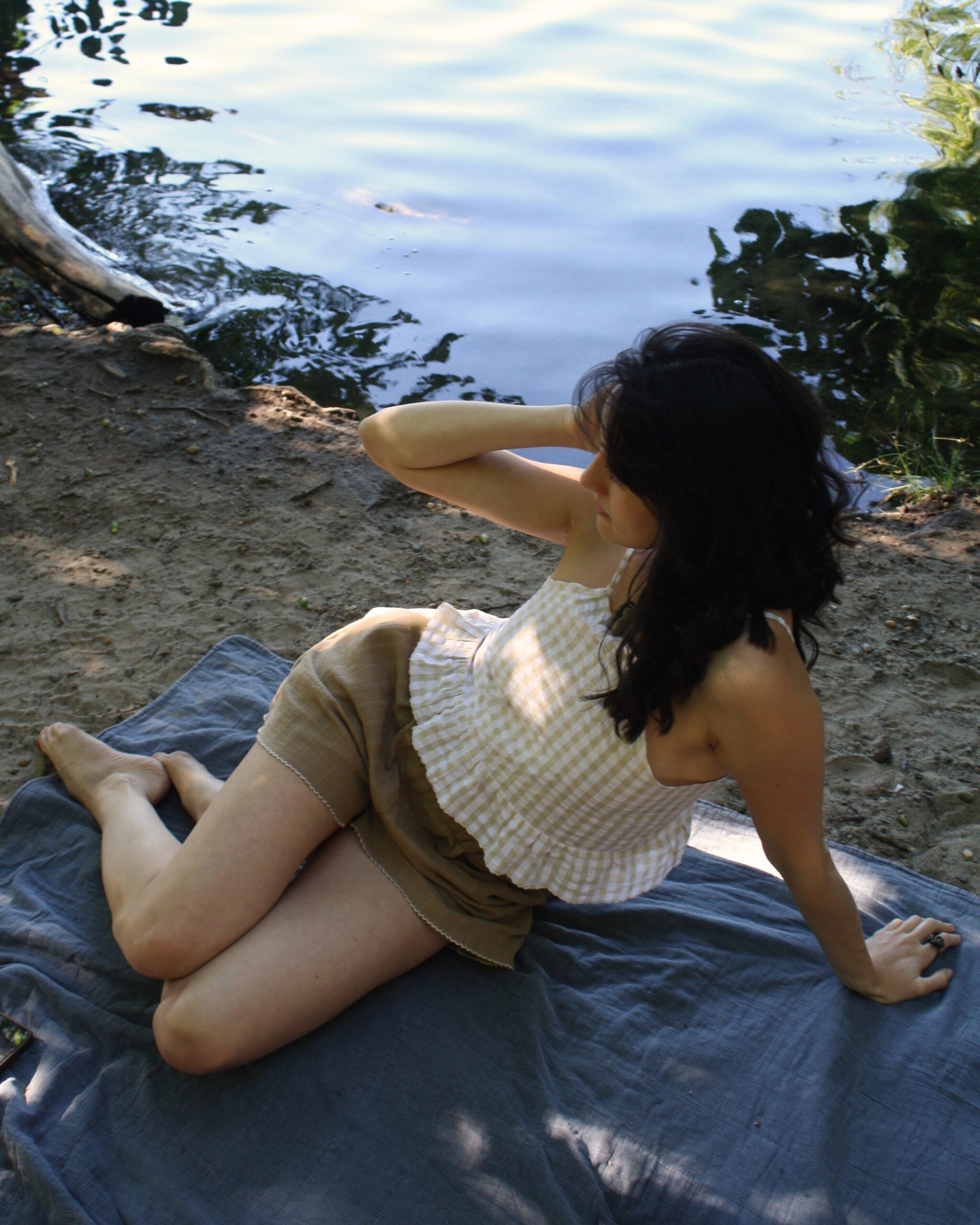 Top with bow tie closure in the back made from organic cotton seersucker.