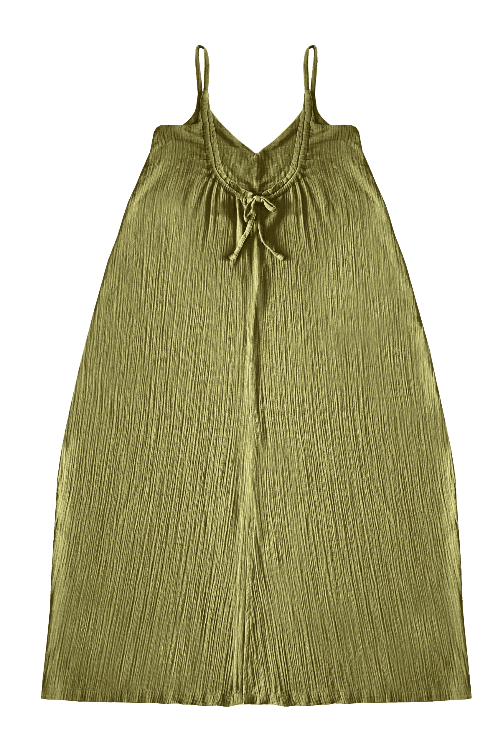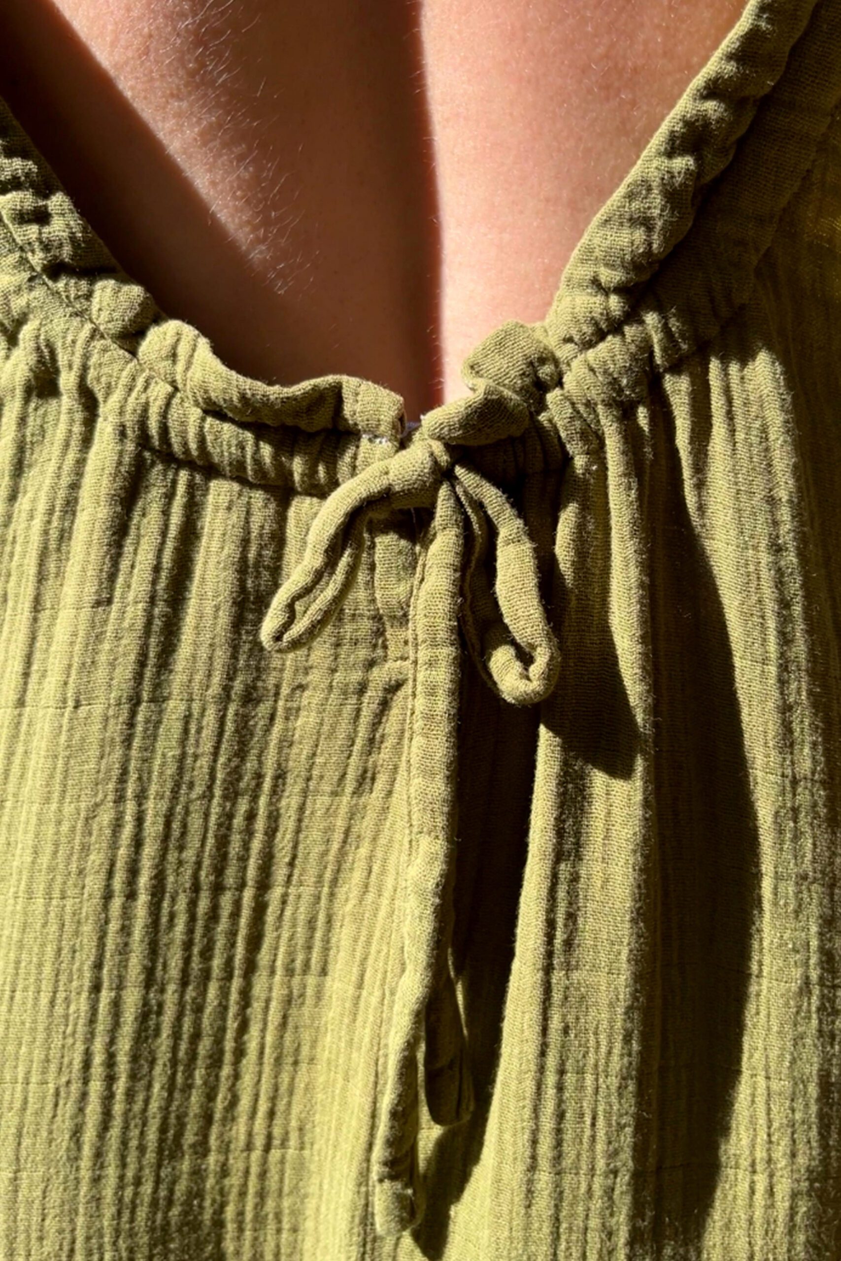 The Muslin Dress Olive is a long, wide dress with a low backline and a bow detail in the back made from a lightweight cotton muslin.