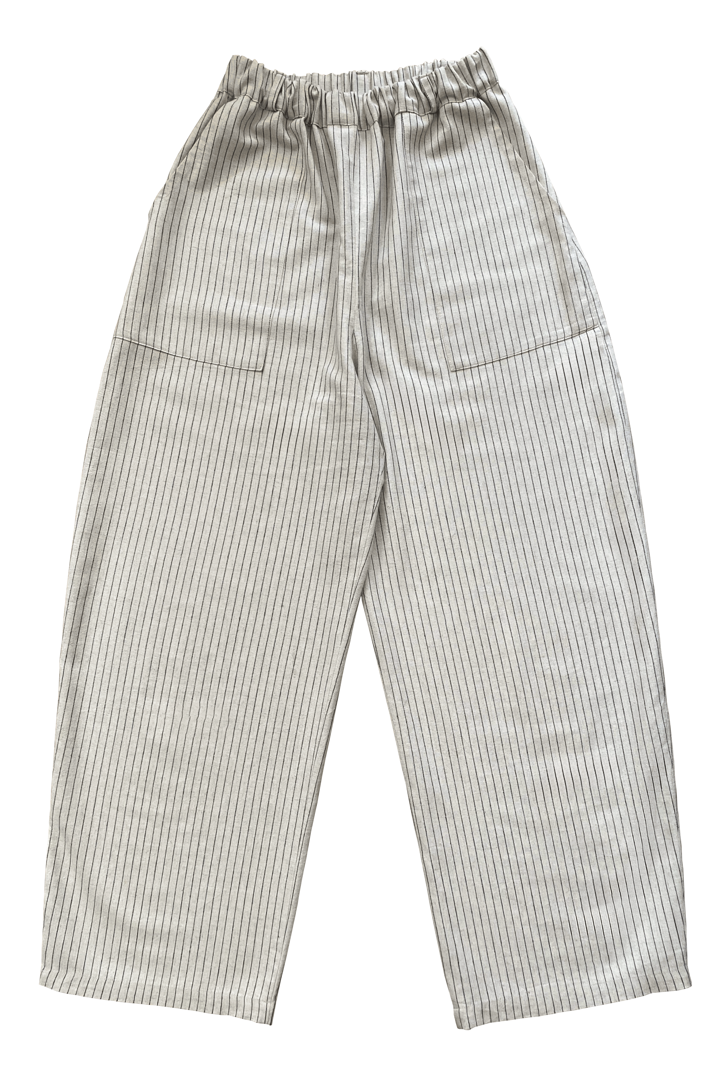 Striped pants with barrel legs, elastic waistband and side pockets, made from a soft cotton linen blend.